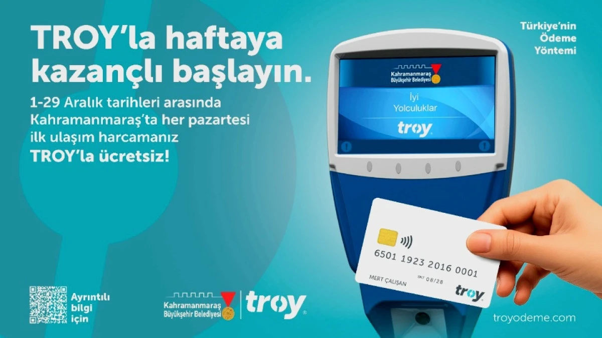 Şehir genelinde hizmet veren Büyükşehir Belediyesi otobüsleri ile özel halk otobüslerinde 1 – 29 Aralık tarihleri arasında her pazartesi günü TROY logolu temassız kredi kartlarıyla yapılacak ilk ulaşım ödemeleri ücretsiz olacak.