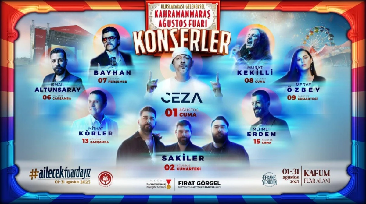 Fuarın en dikkat çeken bölümlerinden biri ise tamamen sponsorların destekleriyle düzenlenecek konserler olacak. Türkiye’nin sevilen sanatçıları Kahramanmaraşlılarla buluşacak. 1 Ağustos’ta Ceza ile başlayacak müzik şöleni, 2 Ağustos Sakiler, 4 Ağustos Burak Bayram, 6 Ağustos İsmail Altunsaray, 7 Ağustos Bayhan, 8 Ağustos Murat Kekilli, 9 Ağustos Merve Özbey, 11 Ağustos Grup Sıra, 13 Ağustos Mithat Körler, 14 Ağustos Süleyman Güçlü ve Furkan Pehlivan, 15 Ağustos Mehmet Erdem, 16 Ağustos İkilem, 18 Ağustos “Oldu O Zaman”, 20 Ağustos Hatice Gökçeli, 21 Ağustos Muhammed Ali Uçar, 22 Ağustos Buray, 23 Ağustos Mustafa Ceceli, 25 Ağustos Mahmut Tuncer, 26 Ağustos Mehmet Hacıbebekoğlu, 27 Ağustos Serkan Kaya, 28 Ağustos Kemal Kutlu, 29 Ağustos Resul Dindar ve 30 Ağustos’ta Gökhan Türkmen konseriyle devam edecek. Fuar boyunca her akşam binlerce kişiyi bir araya getirecek konserlerde sanatçılar, en sevilen şarkılarını Kahramanmaraşlılar için seslendirecek.
