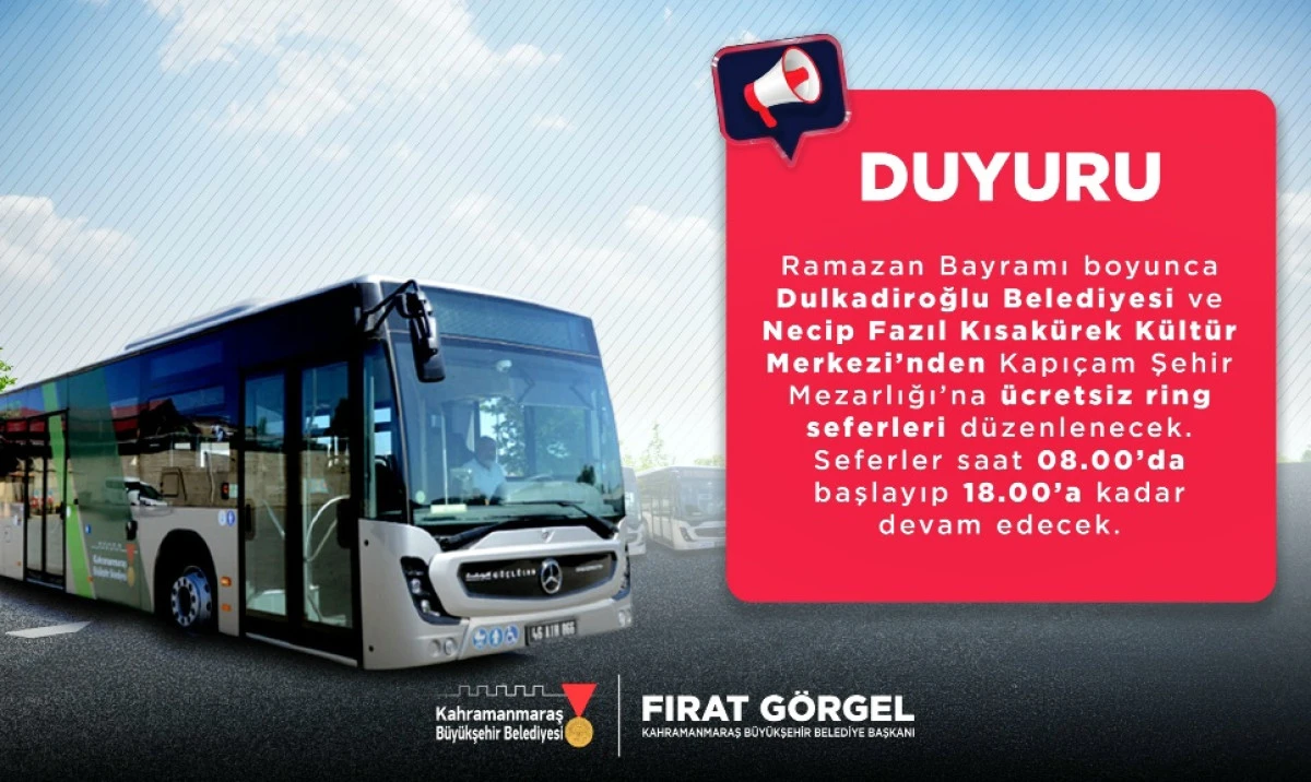 Büyükşehir Belediyesi, ahirete irtihal eden yakınlarını bayramda kabri başında ziyaret etmek isteyen vatandaşlar için Dulkadiroğlu Belediyesi ve NFK Kültür Merkezi’nden Kapıçam Mezarlığı’na ücretsiz ring seferleri düzenleyecek. İlave olarak Necip Fazıl Şehir Hastanesi’ne ulaşım sağlayan otobüslerin güzergahları da Kapıçam’a kadar uzatılacak.