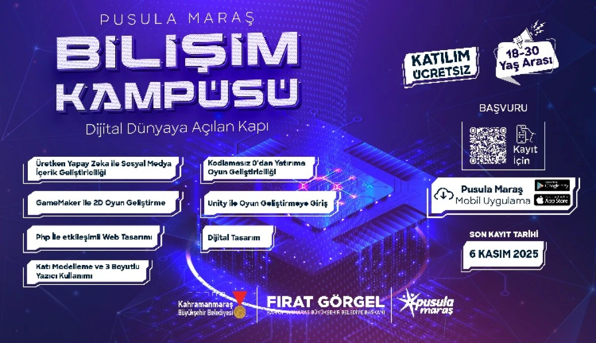 Başvurular, 6 Kasım Perşembe gününe kadar çevrimiçi olarak kabul edilecek. Programa katılmak isteyen gençler, https://kahramanmaras.bel.tr/duyuru/2025/10/27/pusula-maras-bilisim-akademileri-basvuru-formu adresi üzerinden başvurularını kolayca tamamlayabiliyor.