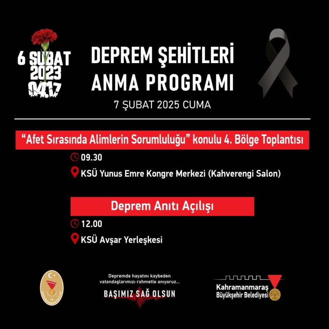 Deprem Şehitleri Anma Programı’nın son günü olan 7 Şubat Cuma günü KSÜ’de “Afet Sırasında Âlimlerin Sorumluluğu” konulu 4. Bölge Toplantısı ve Deprem Anıtı’nın açılışı gerçekleştirilecek. Programlara tüm vatandaşlar davet edildi.
