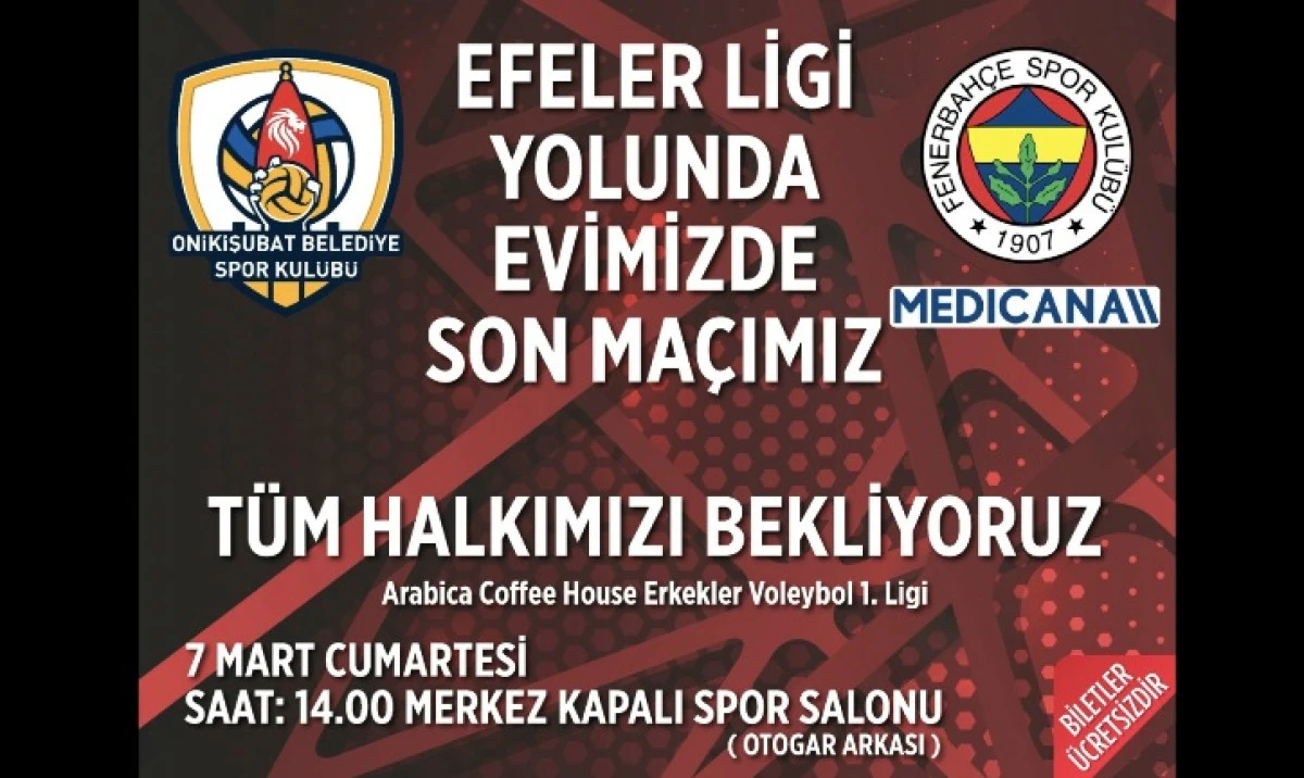 Sezon boyunca ortaya koyduğu mücadeleci oyun, azim ve takım ruhuyla dikkat çeken Onikişubat Belediye Spor Kulübü Erkek Voleybol Takımı, taraftarının desteğini arkasına alarak önemli bir galibiyet hedefliyor. Sahada ter döken Filenin Aslanları, sezonun evindeki son maçında Kahramanmaraşlı voleybolseverlerle birlikte büyük bir atmosfer oluşturmak istiyor.