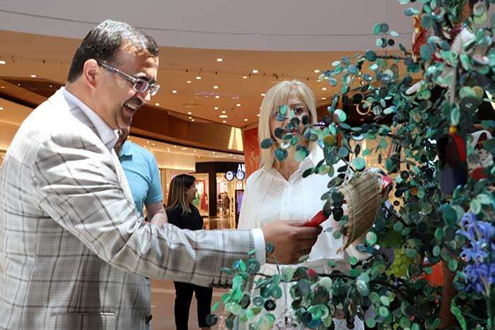 15 bin geri dönüşüm düğmesi ile oluşturulan ve Maraş’ın kültürel yapısından beslenen geri dönüşüm temalı Maraş Ağacı’nda tarhanadan dondurmaya, Maraş gülünden Maraş işi nakışa, küleğinden abasına, sim sırmadan mozaiklere, Kurtuluş Madalyası’ndan sümbüle, çöreğinden bakırına, Çomçalı Gelin’den devemeye, dahası Maraş’a dair herşey mevcut.