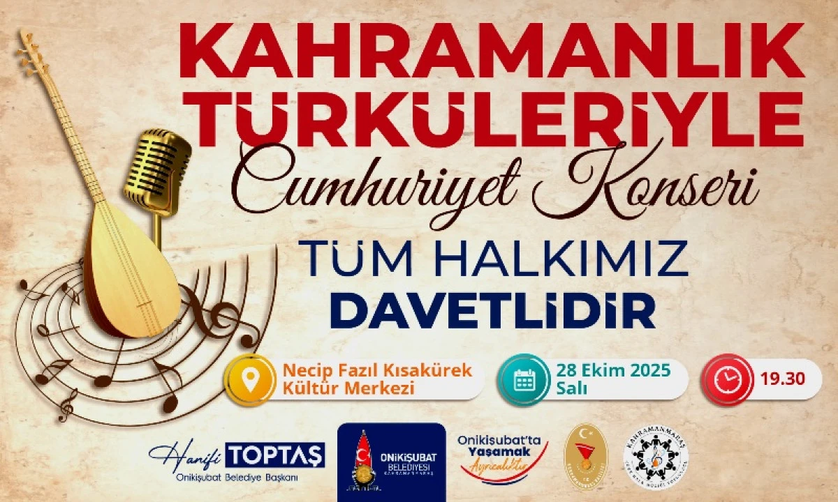Türkiye Cumhuriyeti’nin 102’nci kuruluş yıl dönümü, Onikişubat Belediyesi’nin düzenleyeceği anlamlı bir konserle kutlanacak. “Kahramanlık Türküleriyle Cumhuriyet Konseri” adıyla gerçekleştirilecek etkinlik, kahramanlık destanlarımızı anlatan ezgilerle vatandaşlara unutulmaz bir gece yaşatacak.