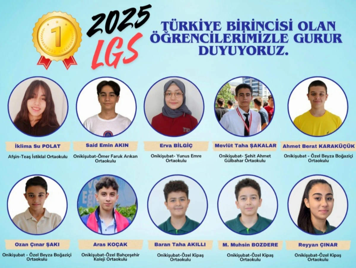 Liselere Geçiş Sistemi (LGS) kapsamında yapılan merkezi sınavda Kahramanmaraş’tan 10 öğrenci 500 tam puan alarak Türkiye birincisi oldu. Öğrencilerimizin bu büyük başarısı, hem ilimizde hem de ülke genelinde büyük gurur ve sevinçle karşılandı.