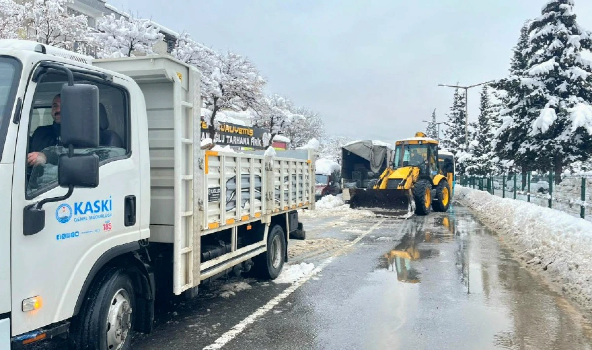 KASKİ Genel Müdürlüğü, şehir merkezinde yürütülen kar küreme, tuzlama ve solisyon uygulamalarına 28 iş makinesiyle destek vererek arterlerin ulaşıma açık tutulmasına katkı sağlıyor.