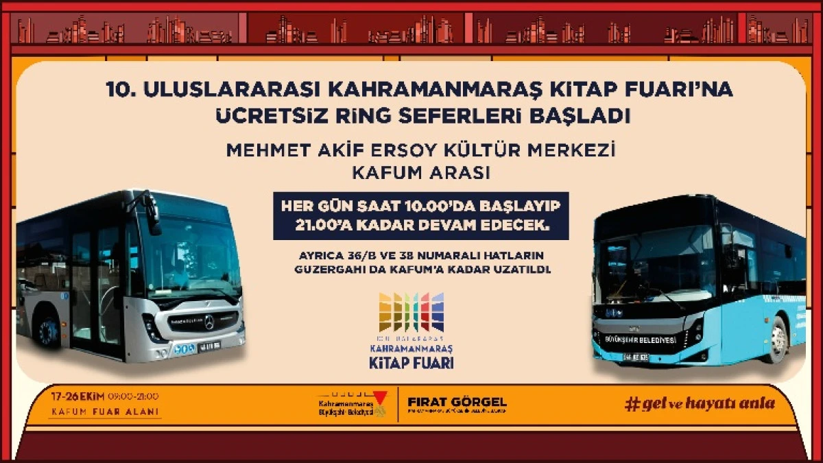 Büyükşehir Belediyesi, vatandaşların 10. Uluslararası Kahramanmaraş Kitap Fuarı’na kolay ulaşımını sağlamak için KAFUM ve Mehmet Akif Ersoy Kültür Merkezi arasında ücretsiz ring seferleri başlattı.