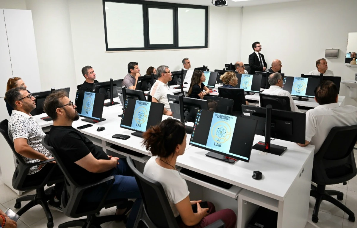 Kurdele kesiminin ardından Rektör Prof. Dr. Alptekin Yasım ve katılımcılar, laboratuvarı gezerek yapay zeka tarafından hazırlanan tanıtım filmini izlediler.