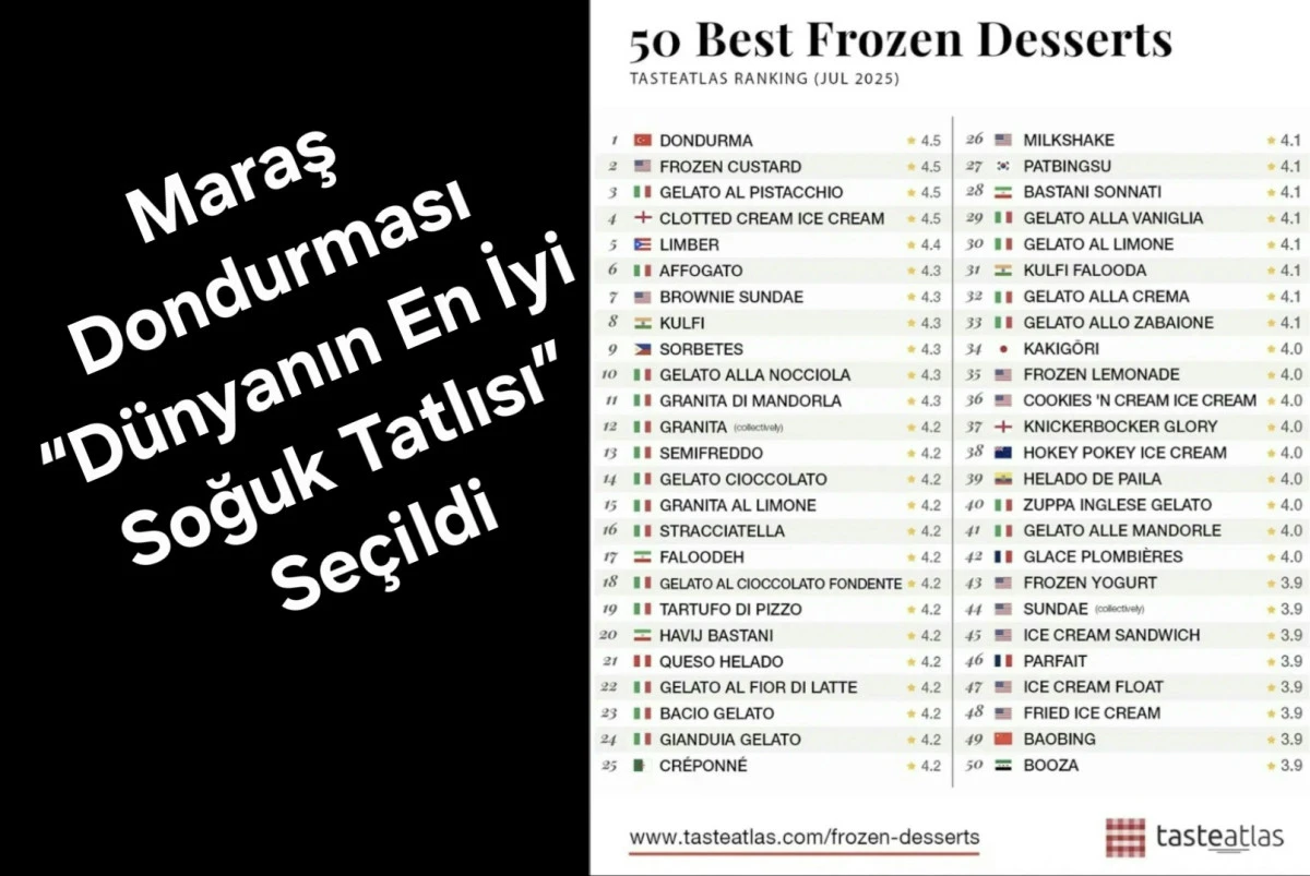 Dünyanın en popüler gastronomi platformlarından biri olan TasteAtlas, geleneksel Maraş Dondurması’nı “Dünyanın En İyi Soğuk Tatlısı” olarak ilan etti. Yüzlerce yerel ve geleneksel lezzetin değerlendirildiği küresel listede zirveye oturan Maraş Dondurması; kendine özgü kıvamı, dayanıklılığı, kesilme şekli ve eşsiz sunumuyla dikkat çekti.