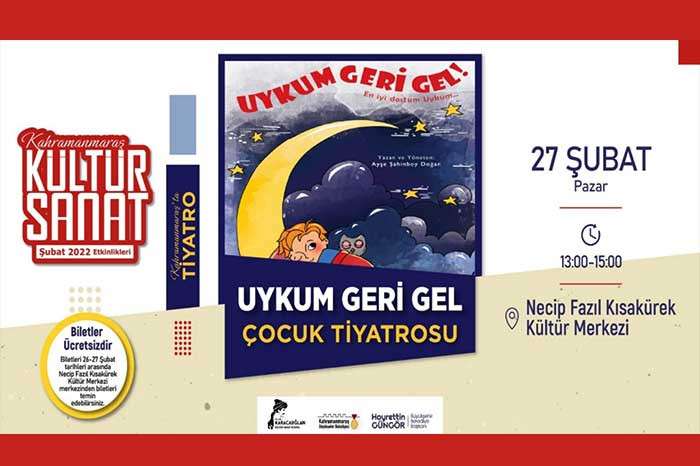Kahramanmaraş Büyükşehir Belediyesi Şubat Kültür Sanat Etkinlikleri kapsamında tiyatro gösterileri, konferans ve söyleşi gibi pek çok program sanatseverlerle buluşturulmaya devam ediyor. Etkinlik takvimi kapsamında 27 Şubat Pazar günü (yarın) ‘Uykum Geri Gel’ adlı çocuk oyunu miniklerle buluşacak. Necip Fazıl Kısakürek Kültür Merkezi’nde saat 13.00 ve 15.00’da iki seans şeklinde düzenlenecek olan etkinliğe tüm çocuklar davet edildi. Sahnelenecek oyunun biletleri Necip Fazıl Kısakürek Kültür Merkezi’nden ücretsiz olarak temin edilebiliyor.