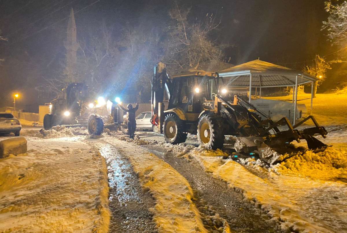 Karla mücadele ekipleri, iş makineleri ve tuzlama araçlarıyla zorlu doğa koşullarına rağmen vatandaşların güvenliği için 7/24 görev yaparken, kapanan ara sokakları açmak için gece gündüz demeden çalışmalarına devam ediyor.