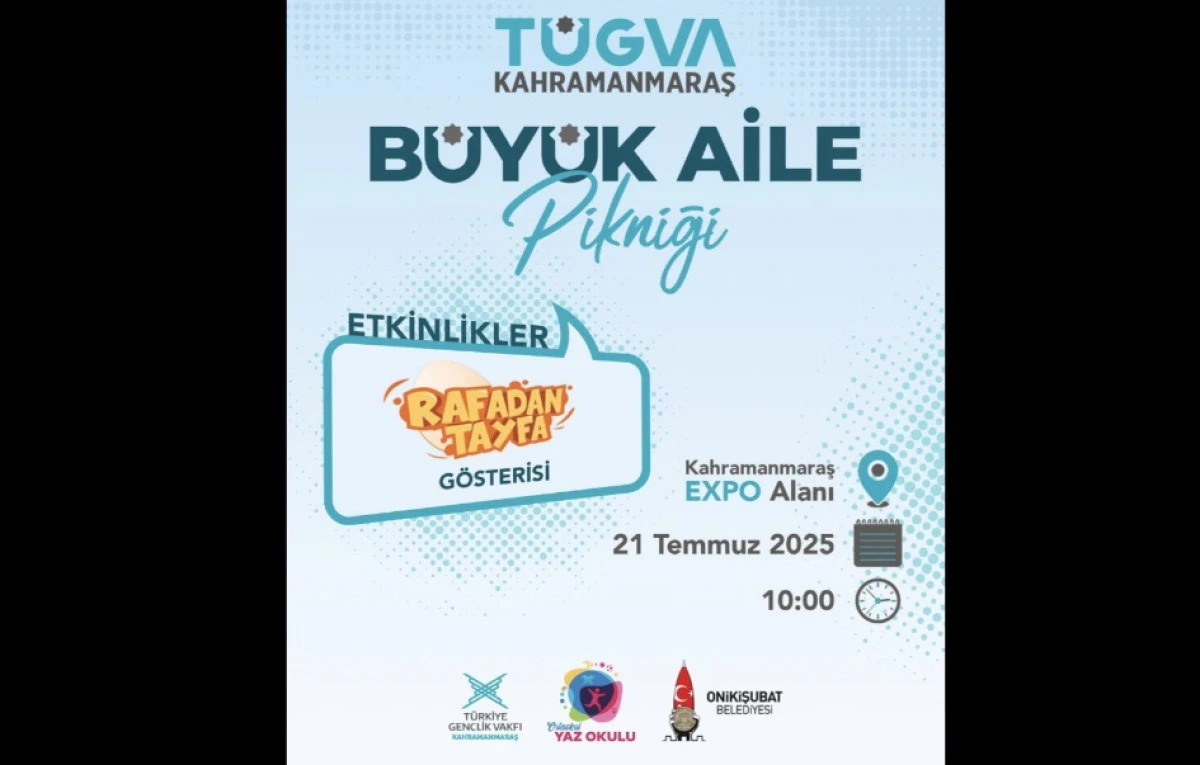 Onikişubat Belediyesi ve Türkiye Gençlik Vakfı (TÜGVA) Kahramanmaraş Temsilciliği işbirliğiyle düzenlenecek olan ‘Büyük Aile Pikniği’, aileleri EXPO Alanı’nda buluşturacak. Pikniğin çocuk katılımcıları ise Rafadan Tayfa sürprizi bekliyor.