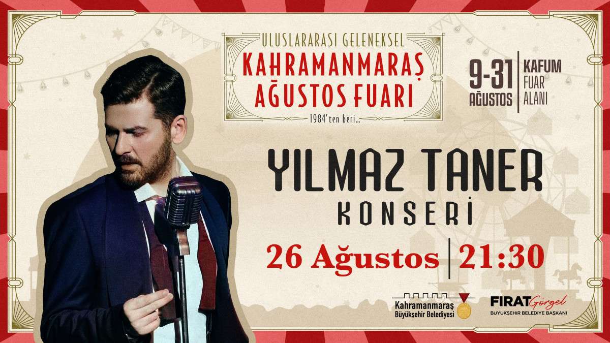 Büyük bir heyecan ve ilgiyle devam eden Uluslararası Kahramanmaraş Geleneksel Ağustos Fuarı, 26 Ağustos Pazartesi günü gerçekleştirilecek müzik ziyafetiyle sürecek. Etkinlik takvimi kapsamında, pop müziğin sevilen ismi Yılmaz Taner, KAFUM Fuar Alanında sahne alacak. Saat 21.30’da başlayacak konserde Taner; Aşk Kazası, Tanıdık, Rivayet, Ben Yaşarım, Felek, Bugün de Bitti ve Ölümsüz gibi sevilen eserlerini müzikseverler için seslendirerek kulakların pasını silecek. Büyükşehir Belediyesinden yapılan açıklamada, 26 Ağustos Pazartesi günü saat 21.30’da KAFUM’da gerçekleştirilecek muhteşem konsere tüm müzikseverlerin davetli olduğu belirtildi.