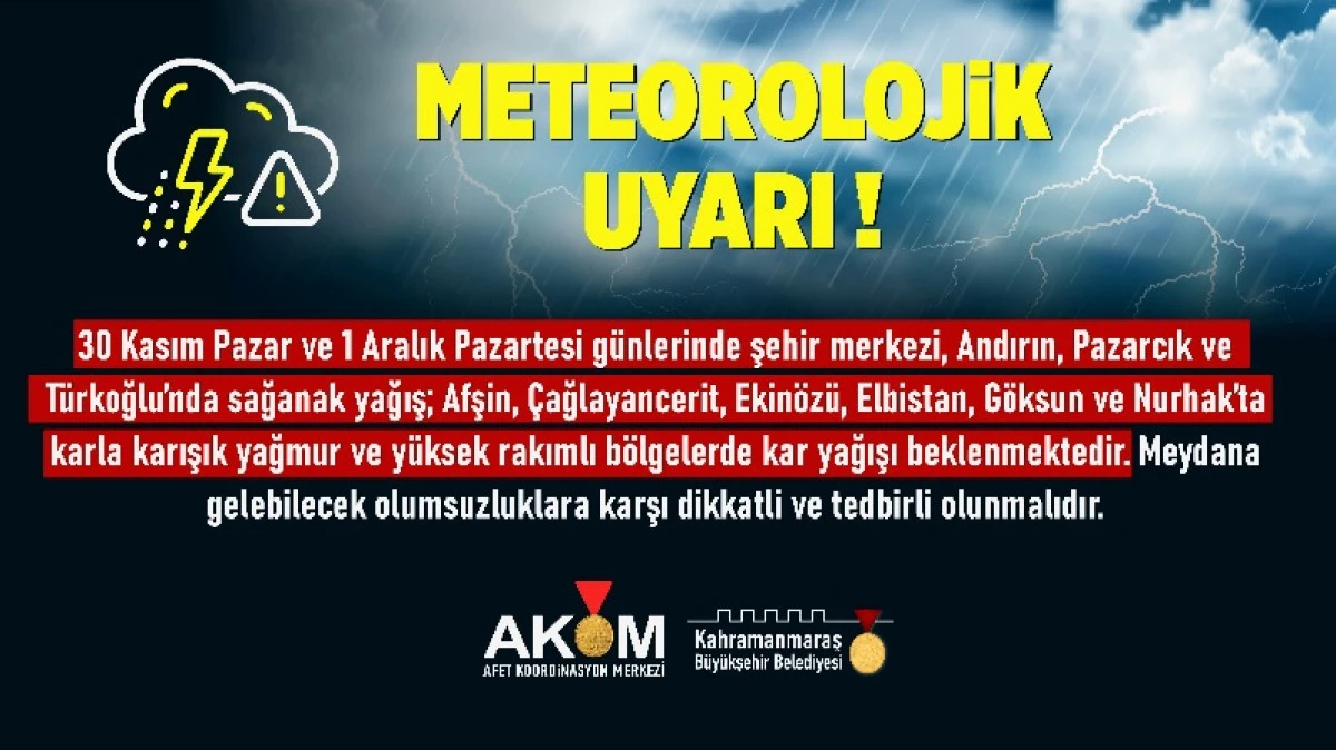 Kahramanmaraş Büyükşehir Belediyesi Afet Koordinasyon Merkezi (AKOM), şehir genelinde hava sıcaklıklarının düşmesiyle birlikte yağışlı havanın etkisini artıracağına ilişkin uyarıda bulundu. Yapılan açıklamada, 30 Kasım Pazar ve 1 Aralık Pazartesi günlerinde şehir genelinde sağanak yağış ve kar yağışının görüleceği bildirildi. Meteorolojik değerlendirmelere göre; şehir merkezi ve güney ilçelerde sağanak yağış, kuzey kesimlerde ise karla karışık yağmur ve kar yağışı bekleniyor. Buna göre şehir merkezinin yanı sıra Andırın, Pazarcık ve Türkoğlu’nda sağanak yağış etkili olacakken; Afşin, Çağlayancerit, Ekinözü, Elbistan, Göksun ve Nurhak’ta karla karışık yağmur ve yüksek rakımlı bölgelerde kar yağışı bekleniyor. Açıklamada, yağışların oluşturabileceği ulaşım aksamaları, buzlanma, görüş mesafesinde azalma gibi olumsuzluklara karşı vatandaşların dikkatli ve tedbirli olmaları gerektiği vurgulandı. Özellikle kuzey ilçelerde gece saatlerinde sıcaklıkların sıfırın altına düşmesiyle birlikte buzlanma riskinin artabileceği belirtildi.