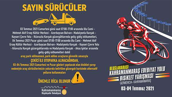 Gerçekleştirilecek Uluslararası Kahramanmaraş Edebiyat Yolu Bisiklet Yarışması kapsamında şehir merkezindeki bazı noktalarda parklanma için alternatif güzergâhların kullanılması isteniyor. Bu kapsamda park yasağı 3 Temmuz Cumartesi günü Ulu Camii - Mehmet Akif Ersoy Kültür Merkezi - Azerbaycan Bulvarı - Madalyalı Kavşak - Kayseri Çevre Yolu - Kılavuzlu Kavşak güzergâhlarında gidiş geliş istikametlerini kapsıyor. 4 Temmuz Pazar günü ise Ulu Camii - Mehmet Akif Ersoy Kültür Merkezi - Azerbaycan Bulvarı - Madalyalı Kavşak - Kayseri Çevre Yolu - Kılavuzlu Kavşak - Aksu Işıklar hattında araç park edilmemesi önem arz ediyor. Yapılan açıklamada, “Sürücülerimiz araçlarını bölgedeki diğer cadde ve sokaklar ile Büyükşehir Belediyemiz bünyesindeki otoparklara park edilebilir" ifadeleri kullanıldı.